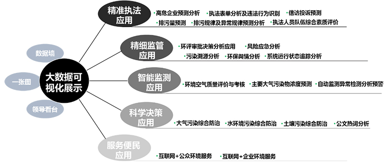 環(huán)境大數(shù)據(jù)分析應(yīng)用:解決數(shù)據(jù)的用(價(jià)值利用)。構(gòu)建各種模型算法,應(yīng)用分析工具、引擎,對(duì)環(huán)境數(shù)據(jù)資源價(jià)值進(jìn)行深入挖掘分析,用數(shù)據(jù)摸清環(huán)境管理現(xiàn)狀,存在的問(wèn)題,預(yù)測(cè)后續(xù)發(fā)展趨勢(shì),助力環(huán)境監(jiān)督管理,實(shí)現(xiàn)對(duì)環(huán)境的精準(zhǔn)執(zhí)法、精細(xì)監(jiān)管、智能監(jiān)測(cè)、科學(xué)決策、服務(wù)便民。